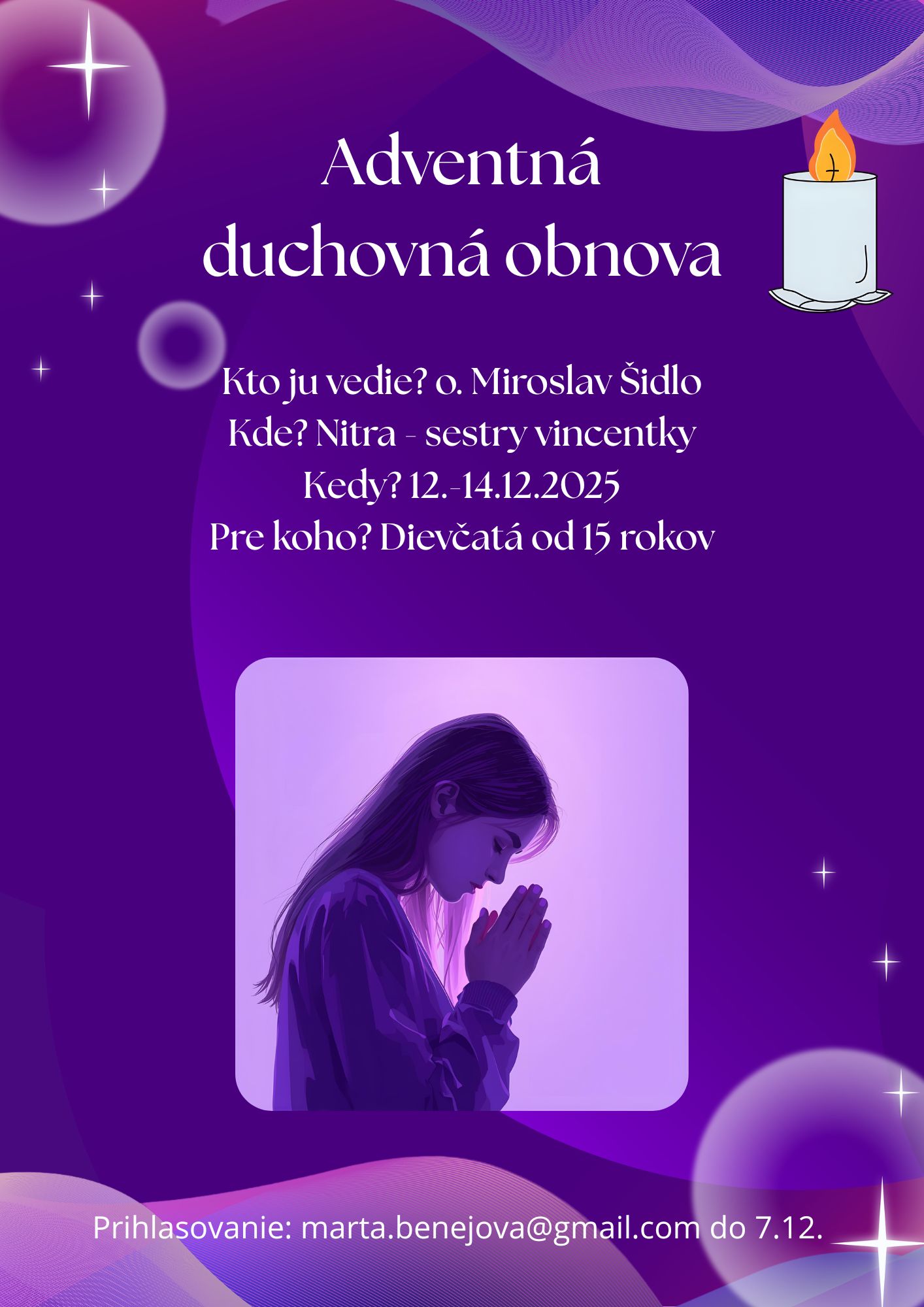 „Zastavte sa v predvianočnom zhone a nájdite pokoj na adventnej obnove. Posilnite vieru a prežite zázrak očakávania Vianoc. Pripojte sa k nám a objavte svetlo pre vaše srdce.“