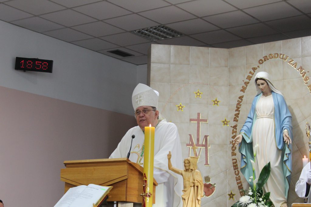 Slávenie pokračovalo slávnostnou sv. omšou, ktorú o 18. hodine celebroval Nitriansky diecézny biskup Mons. Viliam Judák, spolu s Trnavským arcibiskupom Mons. Jánom Oroschom, desiatkami kňazov, diakonov a bratov Misijnej spoločnosti. Vo svojej homílii o. biskup Viliam prešiel históriou Slovenskej provincie DKL, dotkol sa jej počiatkov, samotným Ustanovením provincie, obdobím rozvoja a časom totality. No položil nám aj otázku: “Čím môže poslúžiť toto jubilujúce spoločenstvo dnešnému svetu?” Odpoveď na túto otázku hľadal prostredníctvom literárneho príbehu „Samaritánka“, ktorého autorom je moldavský-sovietsky prozaik Jon Druce. Odkryl nám odkaz tohto vyznania, pretože je veľmi aktuálny aj pre nás. “Bez čistej, nefalšovanej obetavej lásky sa svet obráti na púšť. Stratí zmysel pre pravdu, pre krásu, pre dobro. Dnes svet veľmi žízni po troche čistej, úprimnej lásky a po troške opravdivého, nefalšovaného života. Nájde sa však niekto kto ho ponúkne?”… V závere homílie vo svojom žičení vyprosoval Božiu blízkosť a jeho požehnanie pre všetky sestry aj naďalej, na príhovor pokornej služobnice Panny Márie.